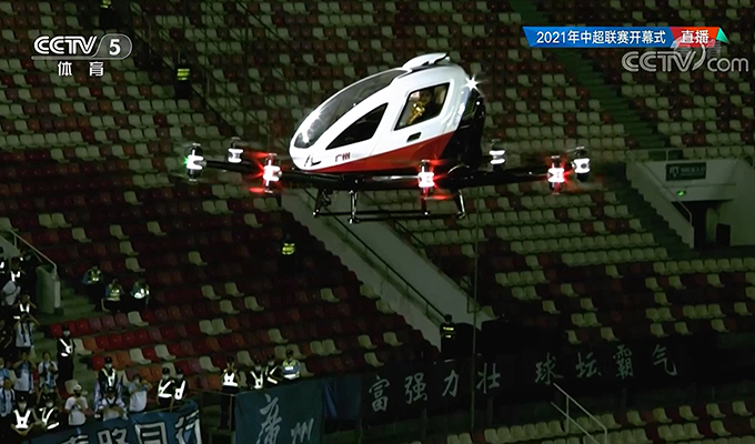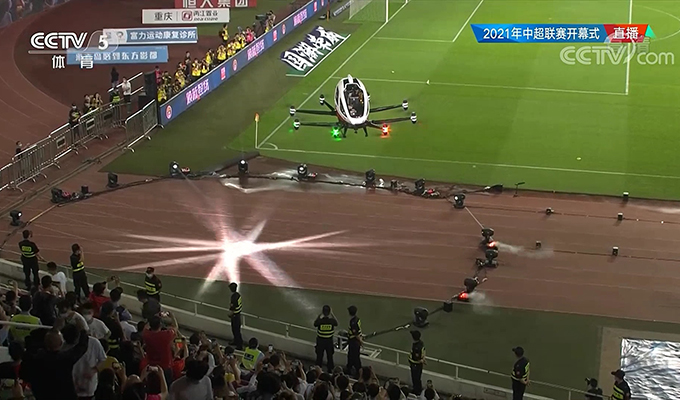 Guangzhou, China, April 21, 2021 -- EHang's flagship product, passenger-grade AAV EH216, made a stunning appearance at the Opening Ceremony of the Chinese Football Association Super League (“CSL”). A staff member rode a EH216 AAV to escort the Vulcan Cup, the Champion Trophy of CSL, successfully landed into Guangzhou Tianhe Stadium. She was greeted by a senior representative from the event sponsor waiting on the ground for the trophy.